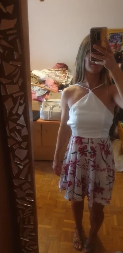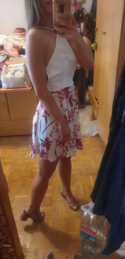 Amazing it only takes a few days to arrive. The dress is beautiful and the unbeatable quality very surprised. The top is tied to the back and is white with thick fabric that does not transparent the chest. The bottom is a skirt sewn to the top very good quality and soft touch the color is very nice.